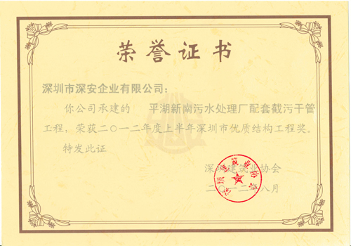 深安企業(yè)平湖新南污水處理廠配套截污干管工程獲優(yōu)質(zhì)結(jié)構(gòu)工程獎(jiǎng)