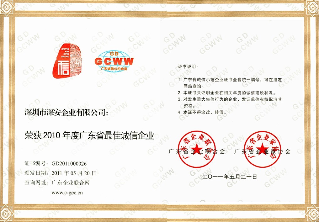 深安企業(yè)獲得“2010年度廣東省最佳誠信企業(yè)”榮譽(yù)稱號(hào)