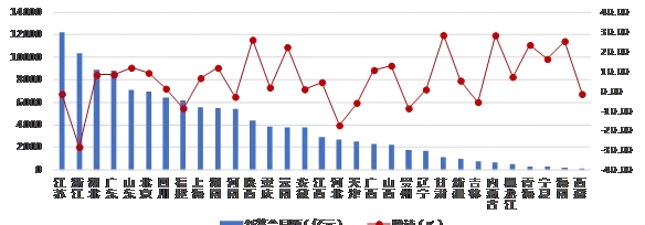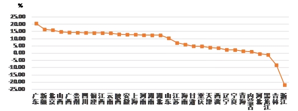 從各地區(qū)建筑業(yè)總產(chǎn)值增長(zhǎng)情況看,有 27 個(gè)地區(qū)的建筑業(yè)總產(chǎn)值較上年同期有不同幅度的增長(zhǎng)。其中,廣東、新疆、北京的增幅均超過(guò) 15%。有 4個(gè)地區(qū)出現(xiàn)負(fù)增長(zhǎng),其中,浙江出現(xiàn)了 超過(guò)20% 的負(fù)增長(zhǎng)(圖 2)。