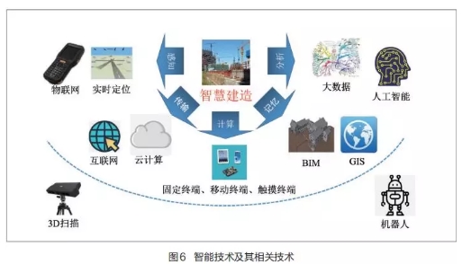 之所以能進行智慧建造,是因為應(yīng)用了相關(guān)的信息系統(tǒng)。裝配式建筑和一般的建筑有哪些不同和特色?我歸納為幾點:首先是裝配式建筑的技術(shù)特色,包括裝配式建筑設(shè)計、構(gòu)件深化設(shè)計、構(gòu)件生產(chǎn)、裝配式建筑施工。和一般的設(shè)計不同,裝配式建筑要進行構(gòu)件的拆分,要在工廠進行制造之前進行深化設(shè)計,如要考慮吊裝的要求、構(gòu)件要進行生產(chǎn)等;其次是裝配式建筑的管理特色,包括構(gòu)件的生產(chǎn)、庫存、配送管理和現(xiàn)場施工管理,與一般的建筑也不一樣。為了使裝配式建筑建造過程實現(xiàn)智慧建造,就需要應(yīng)用相關(guān)的智能技術(shù),從而實現(xiàn)感知、傳輸、計算、記憶、分析等功能。這些智能技術(shù),感知有物聯(lián)網(wǎng)技術(shù)、實時定位技術(shù),傳輸有互聯(lián)網(wǎng)技術(shù)、云計算技術(shù),記憶有BIM模型、GIS數(shù)據(jù),等等。另外,大數(shù)據(jù)、人工智能、3D掃描、機器人等也都是一些實現(xiàn)智慧建造所必須具備的技術(shù)。(圖6)