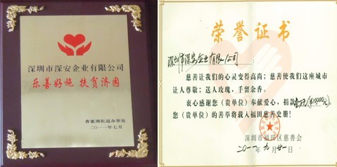近日,深安企業(yè)又向福田區(qū)慈善會(huì)捐贈(zèng)10000元,以關(guān)愛社會(huì)、回報(bào)社會(huì),發(fā)展不忘回報(bào)社會(huì)的義舉,被深圳市福田區(qū)香蜜湖街道辦事處授予“樂善好施 扶貧濟(jì)困”榮譽(yù)稱號。這是深安企業(yè)即2010年向河源市和平縣以及湛江市貧困地區(qū)捐贈(zèng)總計(jì)50000元之后又一捐贈(zèng)活動(dòng)。